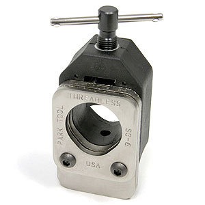 The mighty miter block. What would I do without it? This tool has mitered out a niche in my workshop that nothing can replace. It's putative use is to cut fork steer columns. In the old days, this was even easier than it is now, because my miter block comes with three apertures: two threaded and one not. Formerly you just screwed the threaded steel steer column into the miter block and then cut. Forget that nowadays, because there are no more threaded steerers.