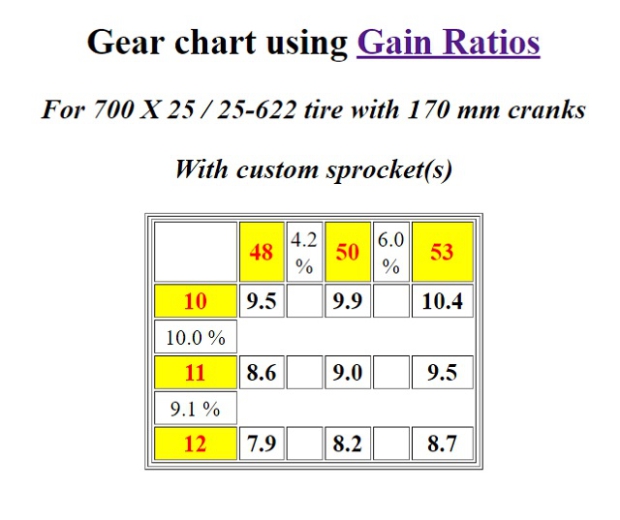 First, let’s focus on the 53 x 11 and 53 x 12 gears. These are the old “standards,” netting 9.5 and 8.7 gain ratios, respectively.