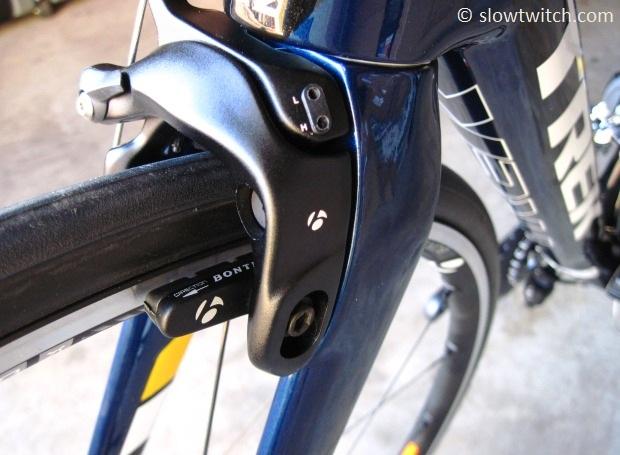 Just where do I set up those pads? What about wide rims? The stock wheels with this bike are Bontrager’s updated Race X Lite model (which we reviewed in 2012 – linked at the bottom of this page). These wheels follow the trend of wider-is-better, and have 23mm rims (measured outside-to-outside at the braking surfaces).