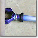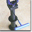 Enter the crown race removal tool by J.A. Stein. The one I have (pictured above and at right) has a pair of adjustable lips, which you slide over the crown race and tighten down with a 5mm Allen wrench. Those flange-like things at the bottom of the photo, one just over the other, are part of a slide hammer. In other words, you've got to bang this crown race off. This tool has the banger built in. No more hammer wielding.
