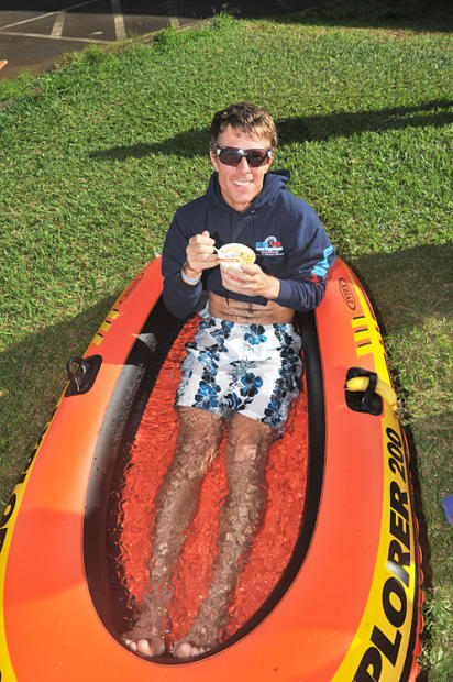 Michael Coughlin can smile while icing the legs that propelled hi to a race-best 7:44:23 split that left him 2nd overall after Day 2.