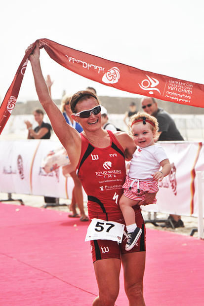 Nikki Butterfield shared the spotlight of her first major triathlon win with her young daughter Savana.