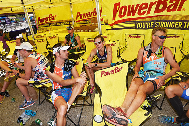 Pros relax in the welcome shade of the Power Bar tent near the finish line.
