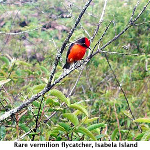 The highlands of Santa Cruz Island are rainy and cooler, and we ventured onto private property to hike through a significant lava tube. Remains of the volcanic origins of the islands, lava tubes are formed when lava pouring downhill creates a solid cooled encasement surrounding a hot liquid flow. When the flow stops, the liquid lava continues to flow downwards by gravity, ultimately leaving an empty tube, often miles long, and in the case of this particular tube, as much as 15m tall. A very low section provided some measure of entertainment as one of the group's participants ended up stomach down in the mud, the same unfortunate person who had mistaken a fresh cow pie for a solid rock a day earlier on the volcano, with predictable results. After the lava tube, we donned rubber boots and headed out to the natural habitat of the Santa Cruz tortoise (on private land) and enjoyed the eating antics of these wild but docile creatures. Weighing in at over 300 pounds (135 kg), adult tortoises eat vast amounts of grass and vegetation. Standing but a few feet away, it was clear these reptiles were much more skittish and shy than their relatives living at the research station.