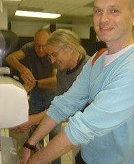 Happily, this was easily accomplished, because the Sands Convention Center obliged us by installing the Dyson hand dryer right next to, instead of in place of, the existing hand dryer that never worked worth a spit. So, I manned the stopwatch while Cervelo’s Gerard Vroomen and Steve Hed each tried their “hand” at drying themselves. Gerard’s partner Phil White took the photos for posterity.