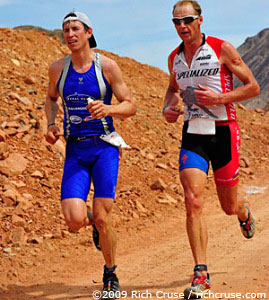 Josiah: The road bike hill climb time trial was 10 miles and went from Vail Village to the cul de sac at Vail Pass halfway up. It was all uphill and averaged a 6 percent grade with some flat sections. I averaged 20 mph, because I was able to get quite a bit of speed on the flats. Nothing crazy. I talked to Greg Krause who won and he kept his bike in the big ring the whole way. I finished overall about 13th or so, about 2 minutes off Krause, who rode about 27:11. My legs were pretty trashed running down those 2,000 vertical feet two hours before. That did not help the situation at all. So I was not keeping it in the big rings.