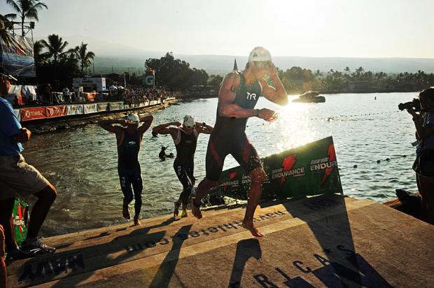 Tension, impatience, relief and sheer exuberance fill the air when the waiting is done and it's time to slip in to the waters of Kailua Bay and await the cannon's blast. For triathletes, the dawn of Ironman Hawaii is birthday, Christmas Day, graduation day, wedding day all wrapped into one big aerobic test of physical readiness and personal character. Awaiting the start, some cope by meditation, others make a few jokes, others retreat into a wall of silent focus before they go out into the blue sea and bright yellow sun to confront the inevitable dark places within themselves that scream "Quit!"