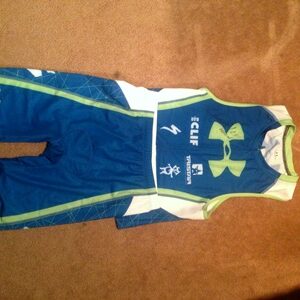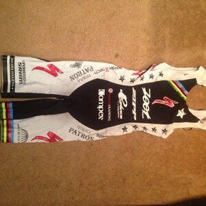 “Fancy-pants technical race uniforms. Washed after wearing. Made of the highest quality synthetic yarns. Some polyesters were harmed in the making of these suits. All kinds of special deluxe sponsor logos. May or may not have crossed the finish line absurdly quickly. Be the envy of your friends. Or your enemies. Or someone you've never even met. Will fit you if you are the exact same size as the athlete it was made for. Or if you want to stretch it way out. Or if you are smaller and like that baggy surfer/skater look. May or may not be the most awesome thing you will ever win in your entire life. Priceless, but don't try to use it to pay your rent. Thanks for looking. All sales final.”