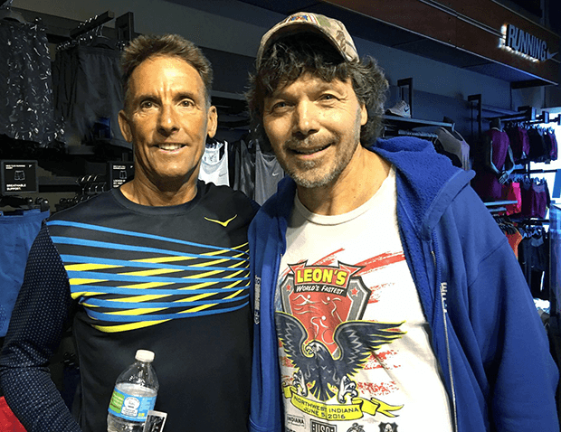 [Publisher’s Note: Marcus Robinson is the inventor of the T-Blocks, the innovative bike rack system you see at many triathlons. Above are images of Leon’s, including a vintage image of Leon Wolek with perennial military category winner Doug Marocco, and a recent image with Dave Scott.]