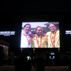 We were going to spend the last night in Beijing doing some shopping and my mission was to find the official Olympic triathlon t-shirts that had been impossible to purchase anywhere else. We headed down to the shopping area around the embassies where it felt like we were in New York or Chicago with a Starbucks and an Apple store in a smallish mall that houses the new Adidas store – but what was great about it is that they had a huge outdoor screen broadcasting the Olympics – and low and behold they show footage of the women's triathlon with Emma crossing the line and the podium shot. Our second stop was at "The Place" which has the world's largest LCD screen – pretty much a screen that serves as an outdoor roof for a almost a block long. A few shops later we were starving and found a nice jazz restaurant as I tried to make it the most romantic anniversary dinner I could (word to the wise for the young multisport enthusiast – choose wisely, for my wonderful wife spent 9 hrs just traveling back and forth to the tri venue in the span of 48 hrs).