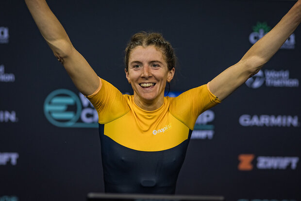 Potter earned a 5 second head start over Beaugrand to begin Stage 3. Zaferas started 30 seconds back. The race for the win was still up in the air and was determined to come down to the run. After 100m of the swim, Beaugrand closed her deficit to one length behind Potter. The effort used to close down that gap, however, seemed to be a big one, as she could not go past Potter. The leading duo would head out of the water and onto the bike together. Beaugrand and Potter were inseparable on the bike. Beaugrand was fastest off of the bike but Potter would still get onto the treadmill first. In this format, every second in transition proved to be crucial. After trading blows throughout the evening, these two women had 1km in front of them to decide who would win the World Title. At the 300m mark, Potter opened up a small lead. Beaugrand was visibly hurting and Potter’s lead quickly grew to 5 seconds. Her lead would balloon to 27 seconds by the finish. She had finally broken Beaugrand, after a little over 30 minutes of racing. Potter took her 2nd World Title in less than 6 months. Zaferas finished in 3rd. On the difficulty of racing indoors, Zaferas said that, “It might be my last time.” Beaugrand collapsed after the final run, and was seen holding her left calf. It looked like a cramp and shows how intense this kind of racing can be. Potter made it look easier than the rest on the final run and can now call herself World Champion.