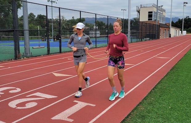 Camp was split into two parts. The first three days were just potential guides and the next three were guides and athletes together. The camp was run by Paralympic VI athlete, Aaron Scheidies, as well as several other USAT coaches. I haven’t spent much time considering what it might be like to be visually impaired, but that quickly changed at the first training session at a local track. During the run, athletes are connected using non-stretchy tethers either by the wrist or at the hip. We practiced by having one guide run with their eyes closed while the other gave commands. Running with your eyes closed feels both terrifying and liberating. It takes some practice to relax and trust that this person guiding you isn’t going to run you into a pole, especially running at speed or through any sort of technical section. I learned quickly that it’s important to know the course routes and mentally plan queues ahead of time, because on the second day, we were running up a new path and came up on an obstacle. I panicked and accidentally led one of the veteran guides, Andrew, into a shin-deep puddle.