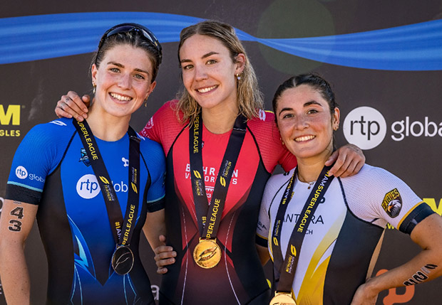Olivia Mathias led the way with a power-packed swim to win the Sharks the first short chute and early on the bike she was joined in the leading group of eight by Sharks teammates Waugh, Sophie Coldwell and Jess Fullagar.
