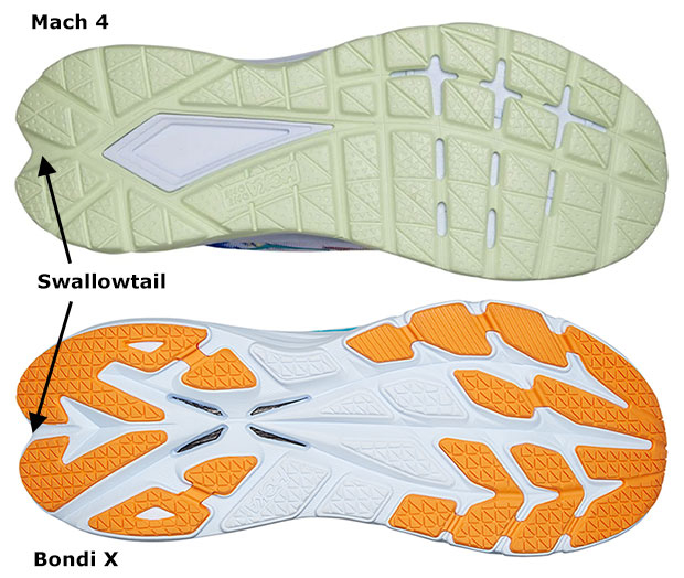There is another feature all these great models share, and that is a different approach to midsole and outsole architecture. It’s the Swallowtail in the rear of the shoe, and it works like independent rear suspension in a car. It provides for a softer landing and the footstrike doesn’t lever the foot to the ground. In the image just above you see this deployed in the Mach 4 and the Bondi X. This feature, and the foam, make both the Mach 4 and the Bondi X run similarly (though the Mach 4 is for sure a lighter, quicker shoe). I point this out because the Mach 4 has no carbon plate, and the current shoe in HOKA’s line that feels most like the Bondi X is the Mach 4. So don’t think it’s just the carbon plate.