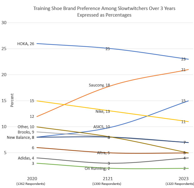 Our latest poll on training footwear preferences show continued gains by Saucony and ASICS