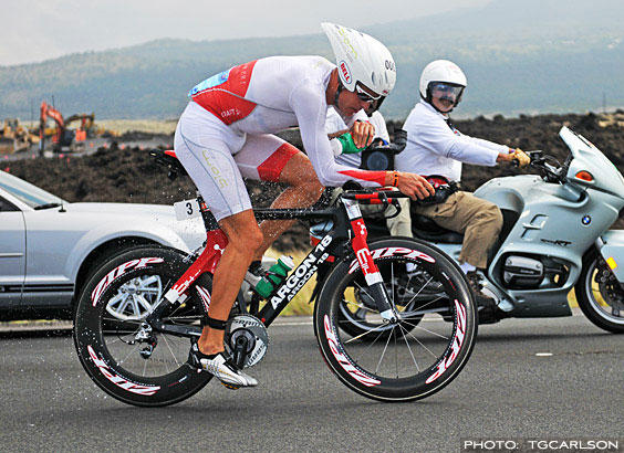 “I sat on the Queen K Highway as the riders were about 5 miles from the end of the bike leg,” he related. “This was about 7 hours into the race. I counted 72 riders, all of whom [of course] had aero bars on their bikes. Of these, 42 were riding with their hands on their pursuit bars.”