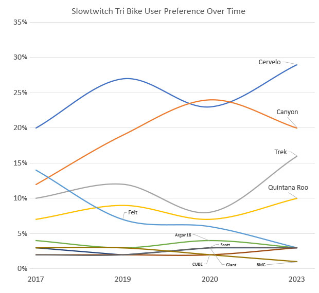Three-quarters of Slowtwitchers who responded say their next tri bike will be Cervelo, Canyon, Trek or QR.
