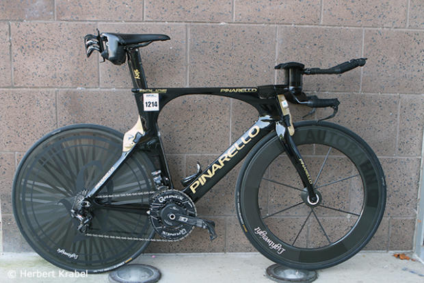 While in Chattanooga for the IRONMAN 70.3 World Championships we stumbled upon this distinctive black and gold Pinarello Bolide and took a closer look.