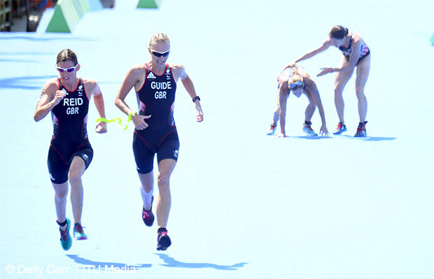 American Liz Baker was in a battle for the bronze medal spot at the Paralympics PT5 triathlon event in Rio when she stumbled and fell.