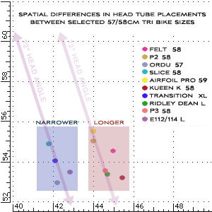 When you get to the 58cm size, tri bikes diverge geometrically. Why? Because they can. The height of these bikes is similar, one to the next. But in reach, there’s more of a divergence.
