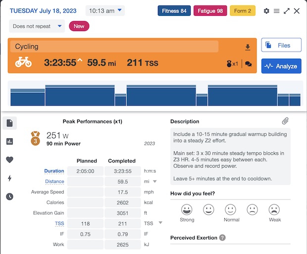 Yesterday, I completed a custom workout outdoors using the ELEMNT BOLT V2. I created the workout using the TrainingPeaks builder, and it synched with my ELEMNT application on my phone. The goal was to do 3x 30 min tempo blocks with 5 minutes rest in between.