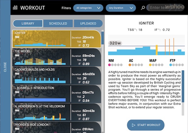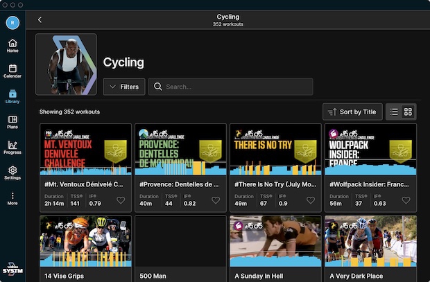 The best way to think of SYSTM is that it serves as the workout library for the Wahoo X ecosystem. There are 352 workouts for cycling and additional workouts for running (126), swimming (77), and yoga (62). Some of these workouts have video content, and all of the original Sufferfest workouts are included on a specific channel within the SYSTM library.