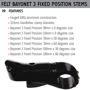 So, Felt is coming out with a half-dozen one-piece stems that will work on the Bayonet 3 fork (this is the fork that comes on the DA frameset). These stems come in three heights—what we'll call low, medium, and tall—and these work out to zero rise, 30mm of rise, and 60mm of rise. By "rise" I'm talking about the height of the centerline of the handlebar clamp versus the height of the head tube top.
