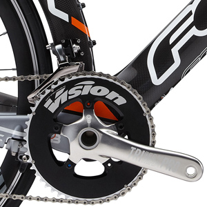 The crankset is Visiontech's aluminum forged Trimax, and I really like this crank. I like it better than some of the carbon cranks that get spec'd on more expensive bikes just because they're carbon. Remember, this crank was spec'd on last year's B10, with a Di2 group, and by all accounts the shifting on that bike, with this crank, was fine. The frame is built BB30, and this is a BB30 crank, so, those who ride a little splay-footed, like I do, enjoy a bit of extra heel clearance. FSA makes various chainrings, and the rings on this bike are rather solid and 5mm thick. This is good, because the bike comes standard with 52/38 rings. If you keep the 52t ring on, or, upsize it, this ring is stiff enough to handle the front derailleur torque while affixed to a 110mm bolt pattern spider.