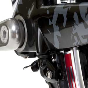 That rear caliper is hidden under the CD0.1's chainstay, behind the BB, and this allows the area behind the seat tube to be cleaned up nicely. My preference is for some sort of center pull caliper when its placed in this spot, because the side pull version sold by TRP (the brake calipers on this bike) generates a cable housing that tends to interfere with the left side crank arm. While the CD0.1 uses this rear caliper, it does build special frame bosses for the caliper that take the place of certain of TRP's brackets, making the rear caliper both lighter and easier to mount. Because these frame bosses include their own left/right calibration system, you have a double set of adjustment screws that help you adjust the trim of its brake pads.