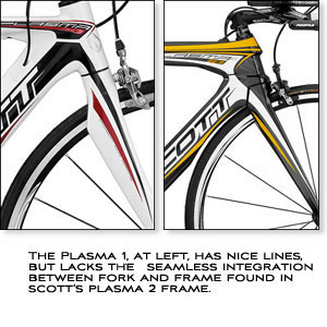 Otherwise, the frame—though not an industrial design triumph, like the Plasma 2 and 3—is very nice, very well made. The fork is not that seamless match for the frame, like the Plasma 2, or the Specialized Transition. But the lines are nice, the cable routing is clean, Scott has done a very nice job here. There are a bevy of frames—the Slice, the Transition, the Equinox TTX, the Plasma 3—that probably never would've gotten made and sold at a price this low were it not for the need for top quality timed race bikes for Pro Tour cycling teams, and I rather think that the Plasma 1 frame is also in that category.