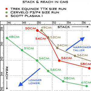 The attached graph (below) riffs off the graph I attached to my write-up of the Trek Equinox TTX 9.0. Scott's Plasma is the king of narrow/tall bikes. If this is the geometry you need, Scott makes a very suitable bike. Who needs a bike like this? A rider who isn't riding steep. If you don't ride steep, then, you probably also don't ride too low in front (if you rode with a shallow seat angle while low in front, you'd be pinched in your hip when you're at top dead center of the pedal stroke).